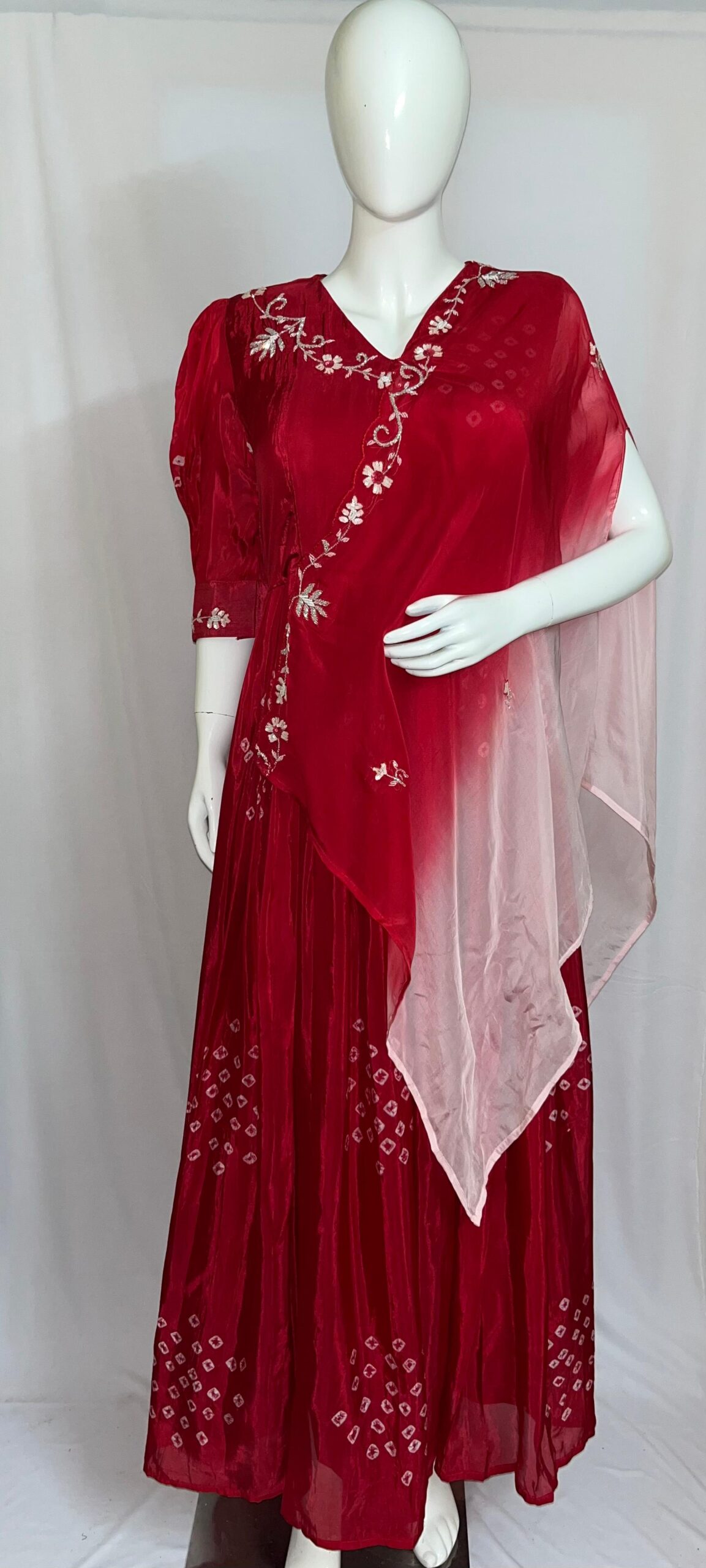 Step into elegance with our stunning Bandhej Print Gown, crafted from pure, premium-quality fabric that promises comfort, grace, and effortless style. This beautiful piece features intricate handwork details, adding a touch of traditional artistry to its timeless design.